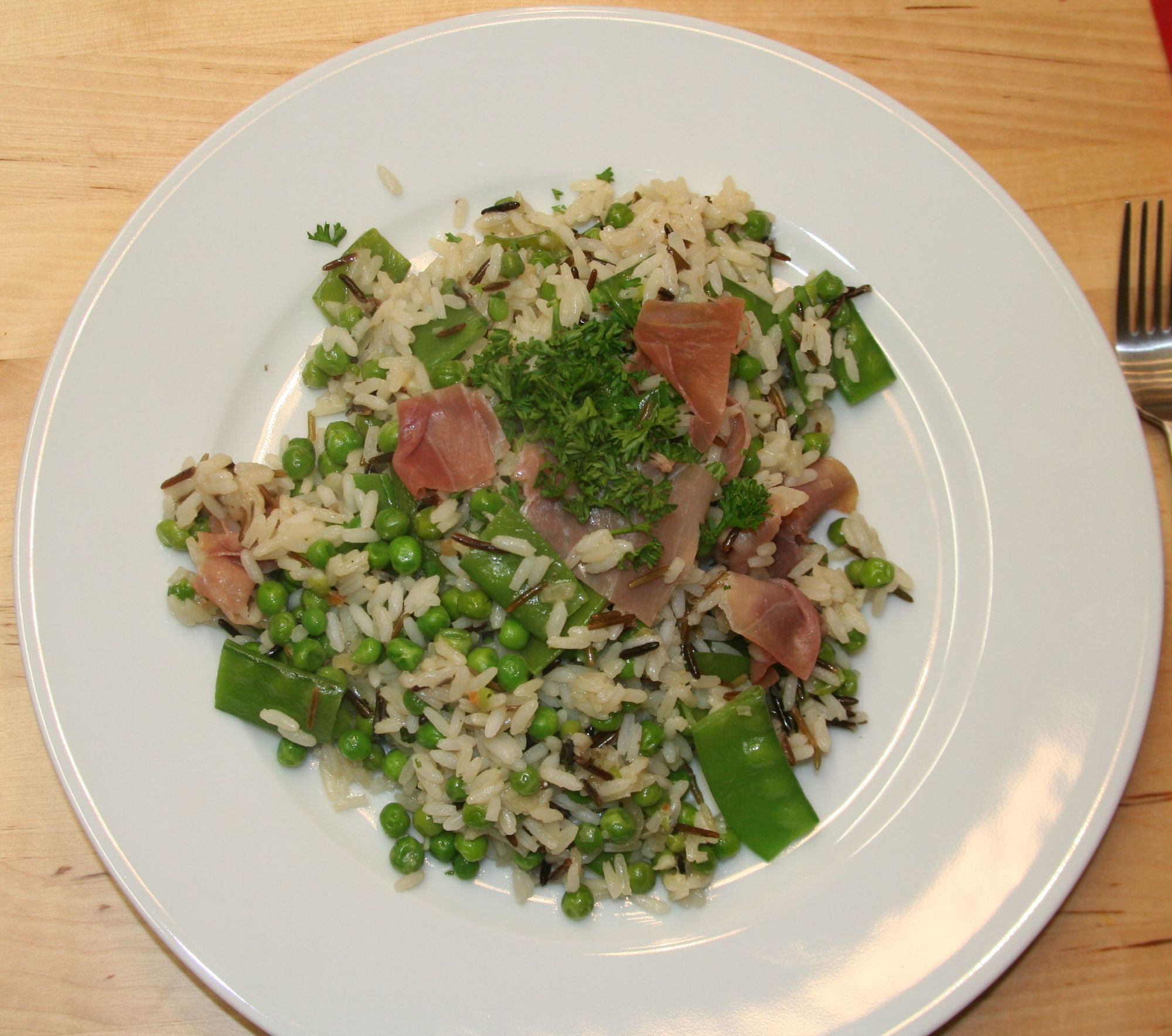 Erbsen-Reis mit Parmaschinken und Parmesan